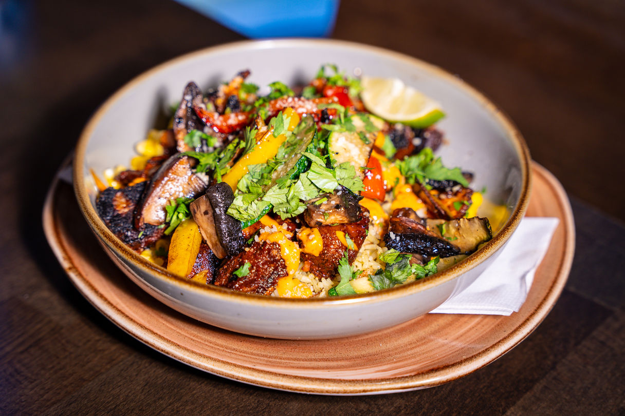 A hearty bowl of cilantro-lime rice topped with sweet corn, sautéed vegetables, chipotle mayo, spicy elote chili seasoning, Parmesan cheese, and fresh cilantro. Served with a lime wedge and finished with your choice of smoked meat.